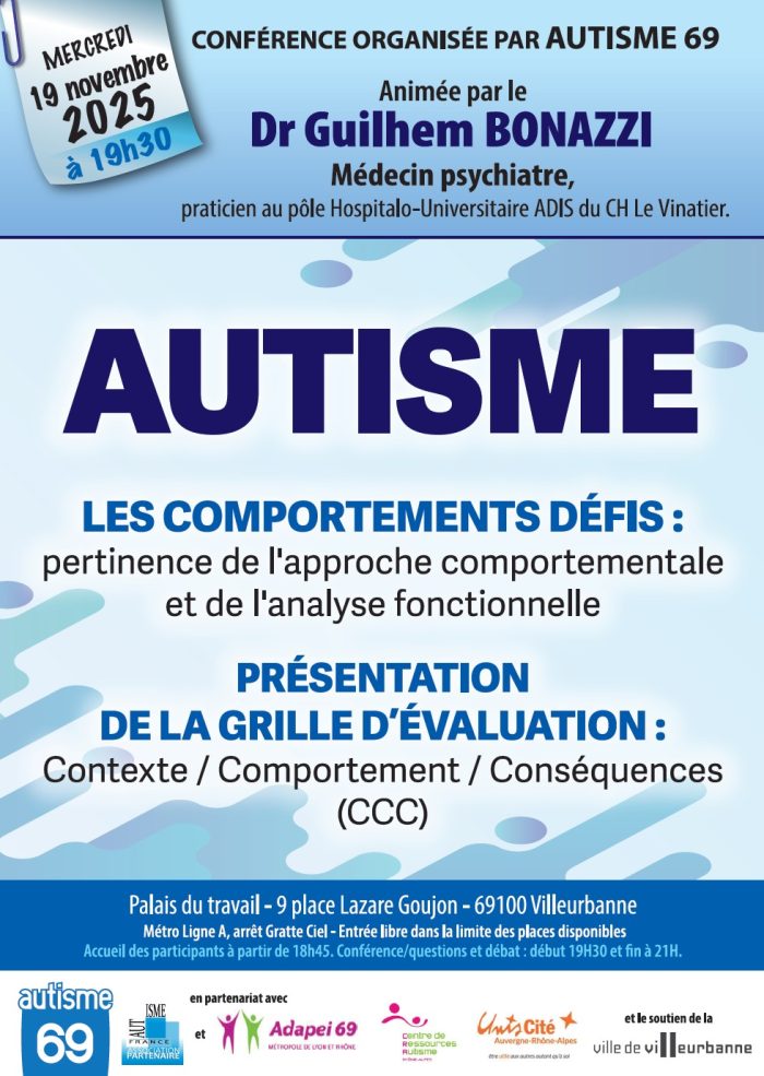 Conférence avec Autisme 69 : Les comportements défis : pertinence de l’approche comportementale et de l’analyse fonctionnelle – 19 novembre 2025 – Villeurbanne