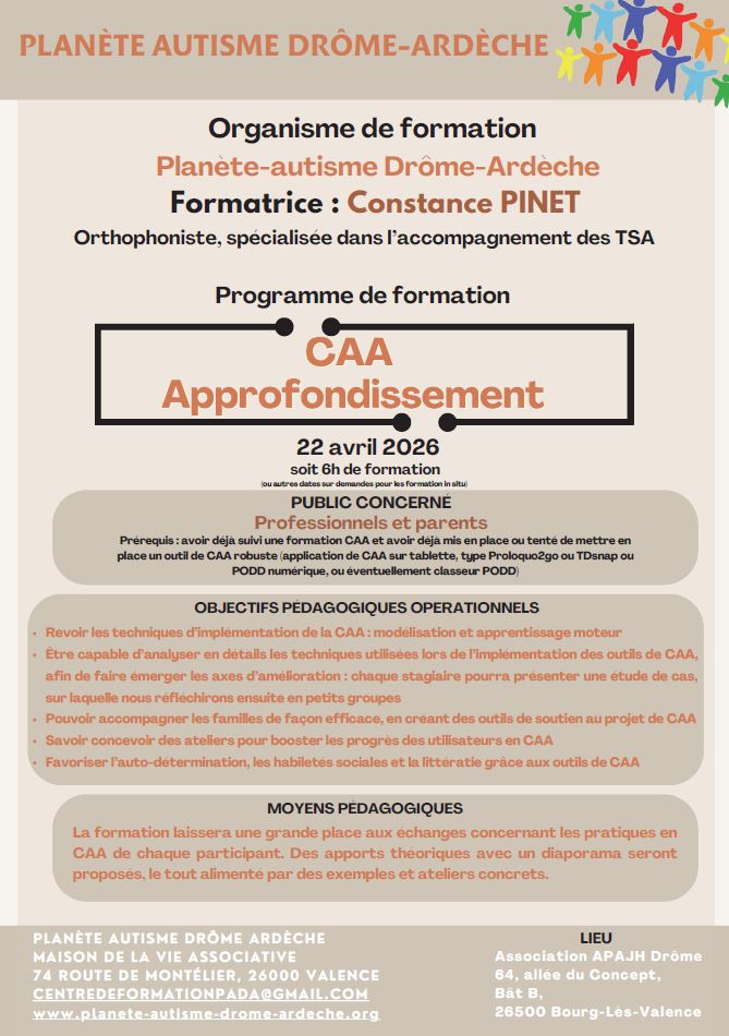 L’association Planète Autisme Drôme-Ardèche propose une session d’un jour de formation autour de la CAA :