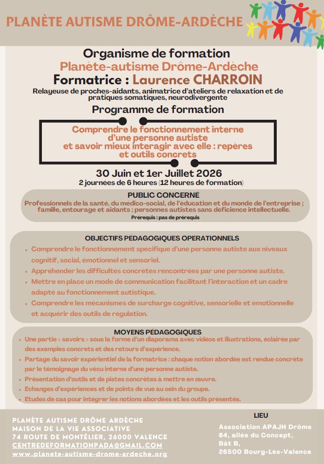 Formation Planète Autisme Drôme-Ardèche : Comprendre le fonctionnement interne d’une personne autiste et savoir mieux interagir avec elle : repères et outils concrets – 30 juin et 1er juillet 2026 – Bourg-Lès-Valence (26)