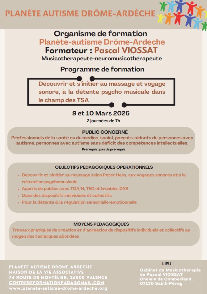 Formation Planète Autisme Drôme-Ardèche : Découvrir et s’initier au massage et voyage sonore, à la détente psycho musicale dans le champ des TSA – 9 et 10 mars 2026 – Saint-Péray (07)