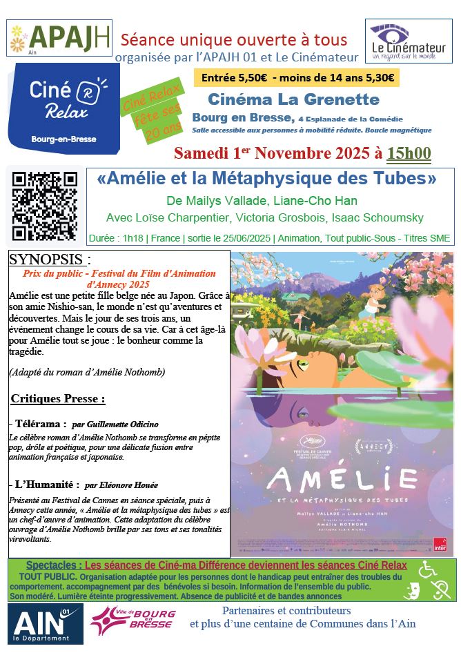 L’APAJH de l’Ain en partenariat avec Le Cinémateur vous proposent une séance de Ciné Relax de Bourg en Bresse, le samedi du 1er Novembre 2025 à 15h00 au cinéma La Grenette à Bourg en Bresse (4 cours de Verdun). Il s’agit du film « AMELIE ET LA METAPHYSIQUE DES TUBES ». Vous trouverez l’affiche en pièce jointe.