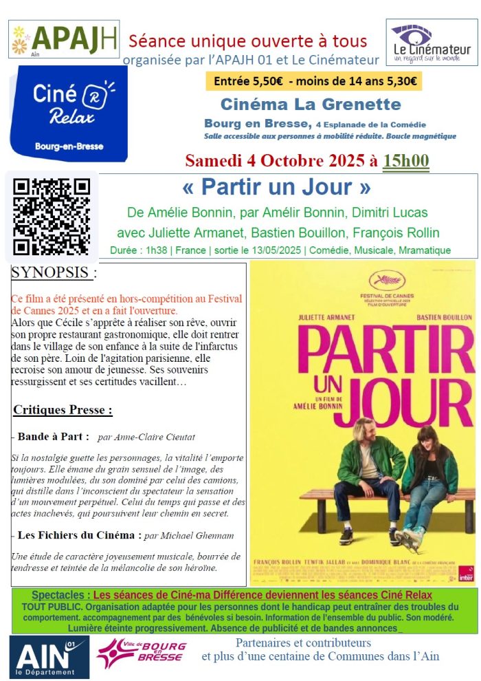 L’APAJH de l’Ain en partenariat avec Le Cinémateur vous proposent une séance de Ciné Relax (Ex Ciné ma Différence) de Bourg en Bresse, le samedi du 4 Octobre 2025 à 15h00 au cinéma La Grenette à Bourg en Bresse. Il s’agit du film « Partir un Jour ».